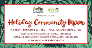 at Sonora Opera HallYou’re Invited to the Holiday Community Mixer! Join us for a festive evening of holiday cheer at the Sonora Opera Hall, co-hosted by the Sonora Chamber of Commerce and Visit Tuolumne! FREE to at...